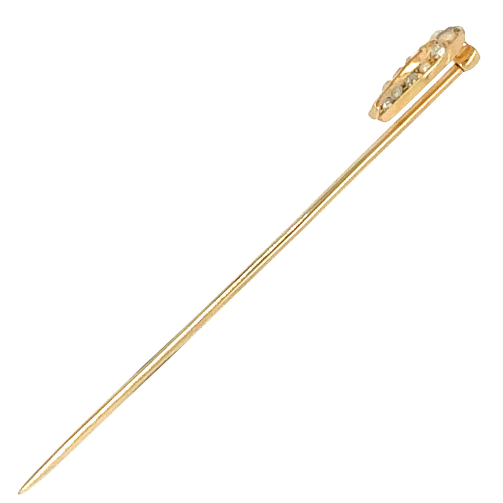 Victorian 15ct yellow gold horse shoe tie pin, set alternately with 13 cultured pearls and rose cut diamonds. Circa 1880.