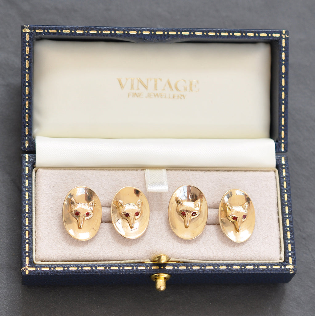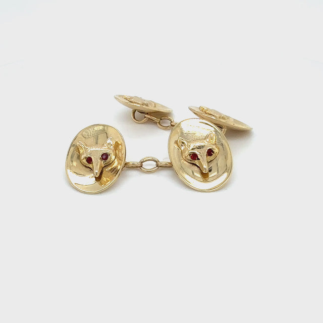 9ct Yellow gold oval concave cufflinks with a fox head with ruby eyes to the centre with ruby eyes. Hallmarked and dated Birmingham UK 1958.