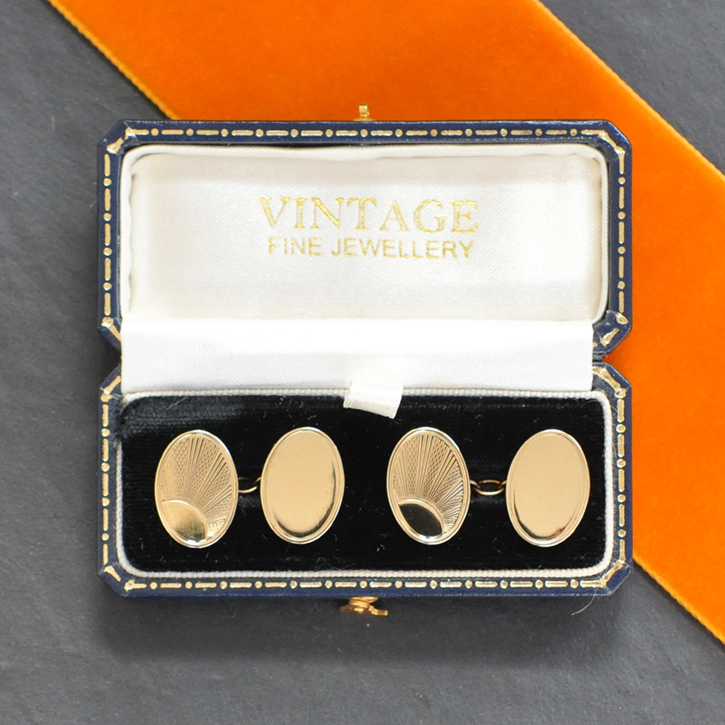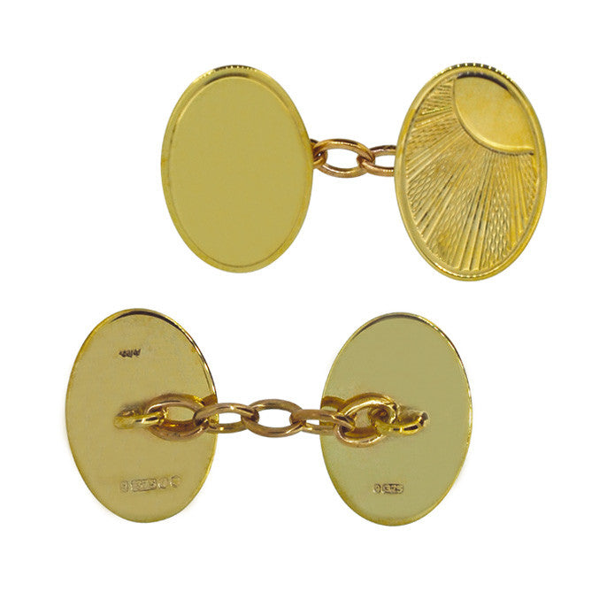 9ct Gold oval cuff links with a 'sun ray' to one side and a plain smooth finish to the other. Chain links, Hallmarked Birmingham 1964.