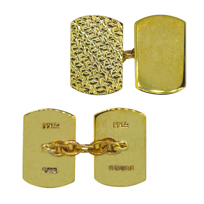 9ct yellow gold rectangular cuff links with an engine turned pattern to one side and the other plain, hallmarked and dated Birmingham 1970.