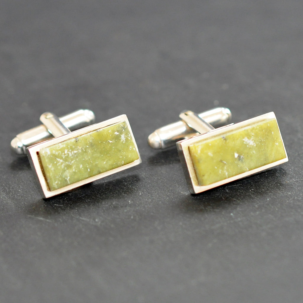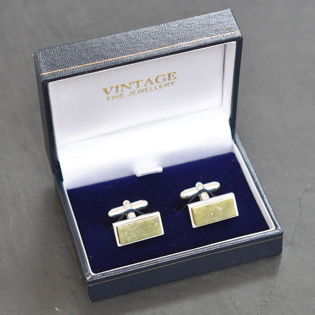 A pair of silver rectangular cuff links with green marble set to the fronts. Swivel backs. Hallmarked Dublin 1971.