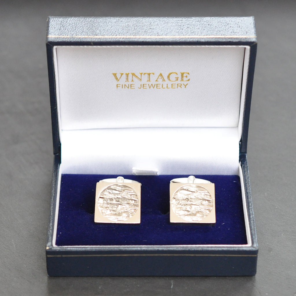 Square silver cuff links with circle of 'bark' texture to the front. Swivel back, tested with acid as silver. Hallmarked Sheffield 1972