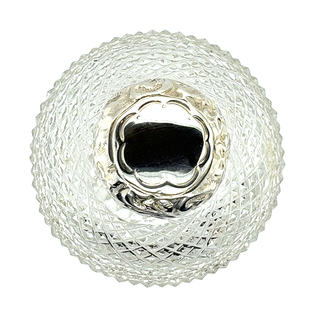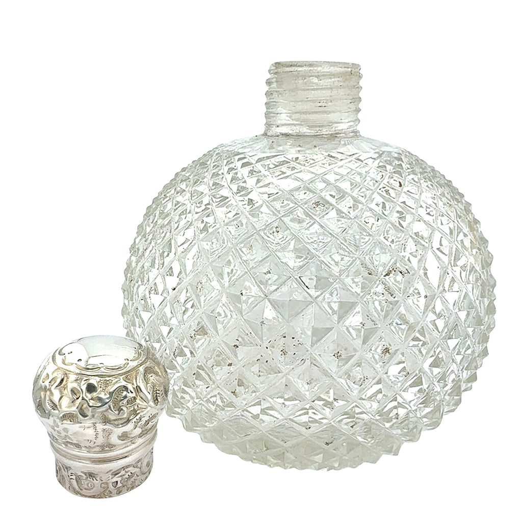 Cut glass scent bottle with a silver fancy screw top. Hallmarked and dated London 1895.