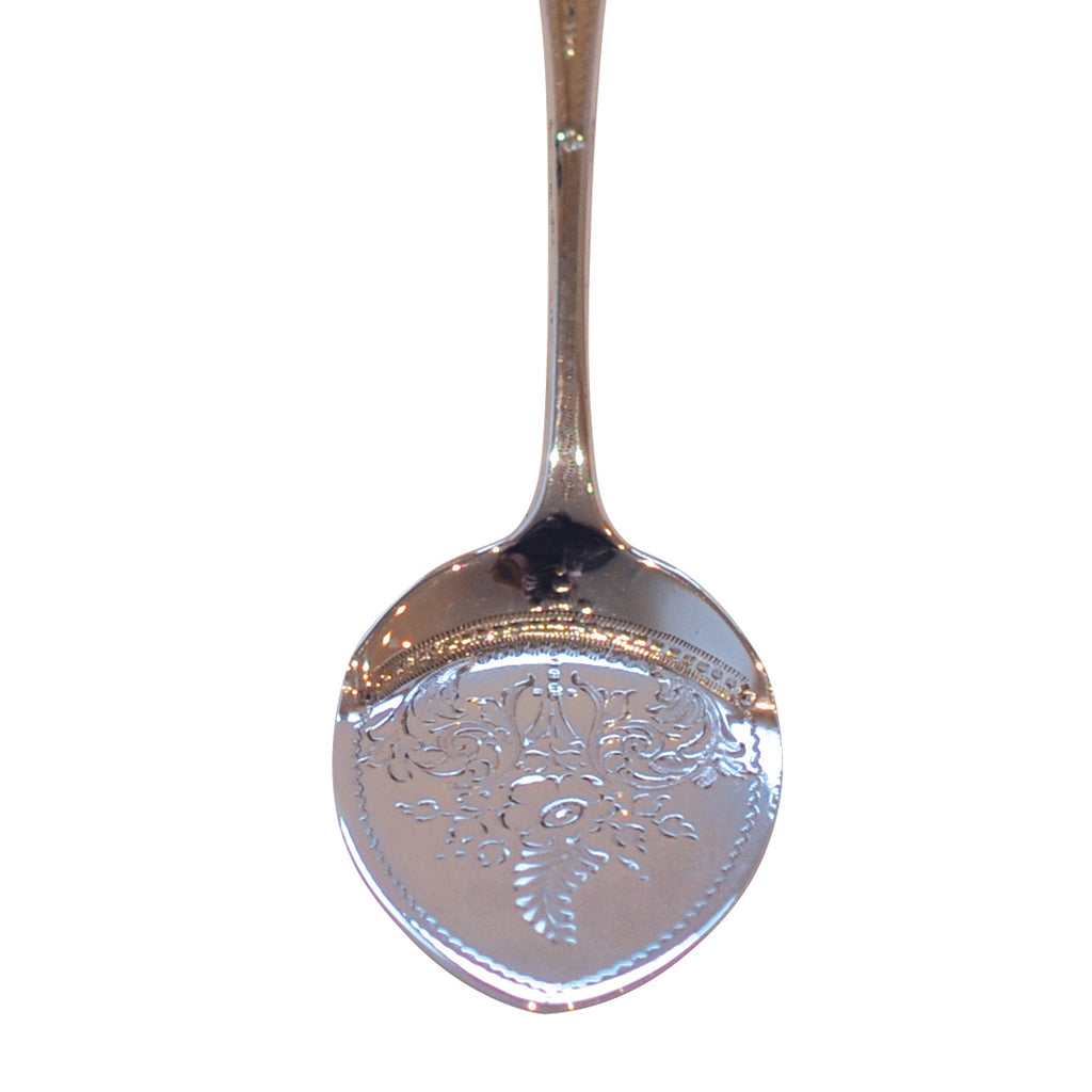Vintage silver jam & preserve spoon with fancy engraving and edge. Hallmarked and dated London 1889.