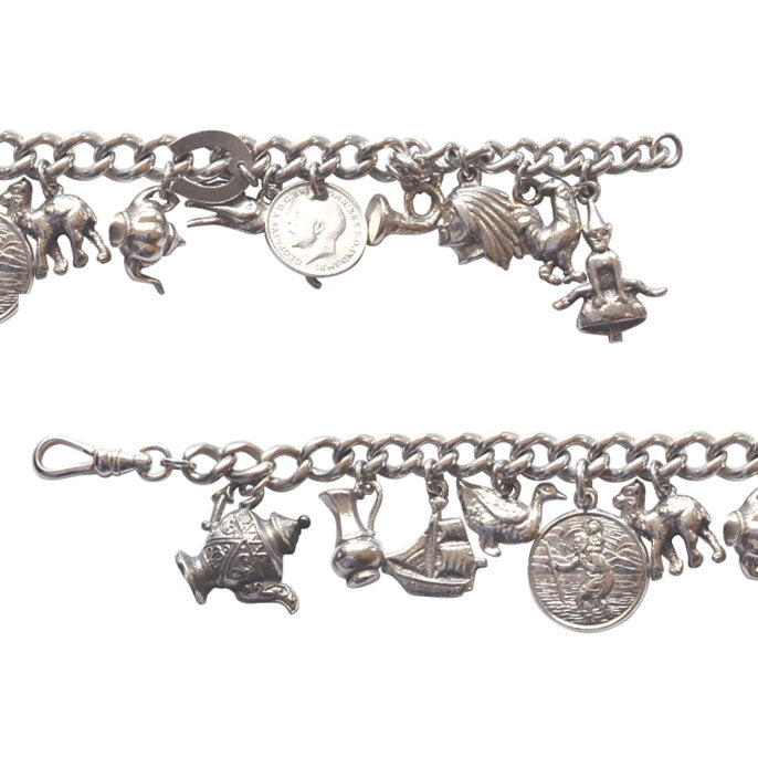 Silver curb link bracelet with 14 charms attached including a teapot, coffee pot, ship, duck, saint disc, camel, teapot, horse shoe, greyhound, coin, french horn, indian, cockerel and elf. Circa 1960s.