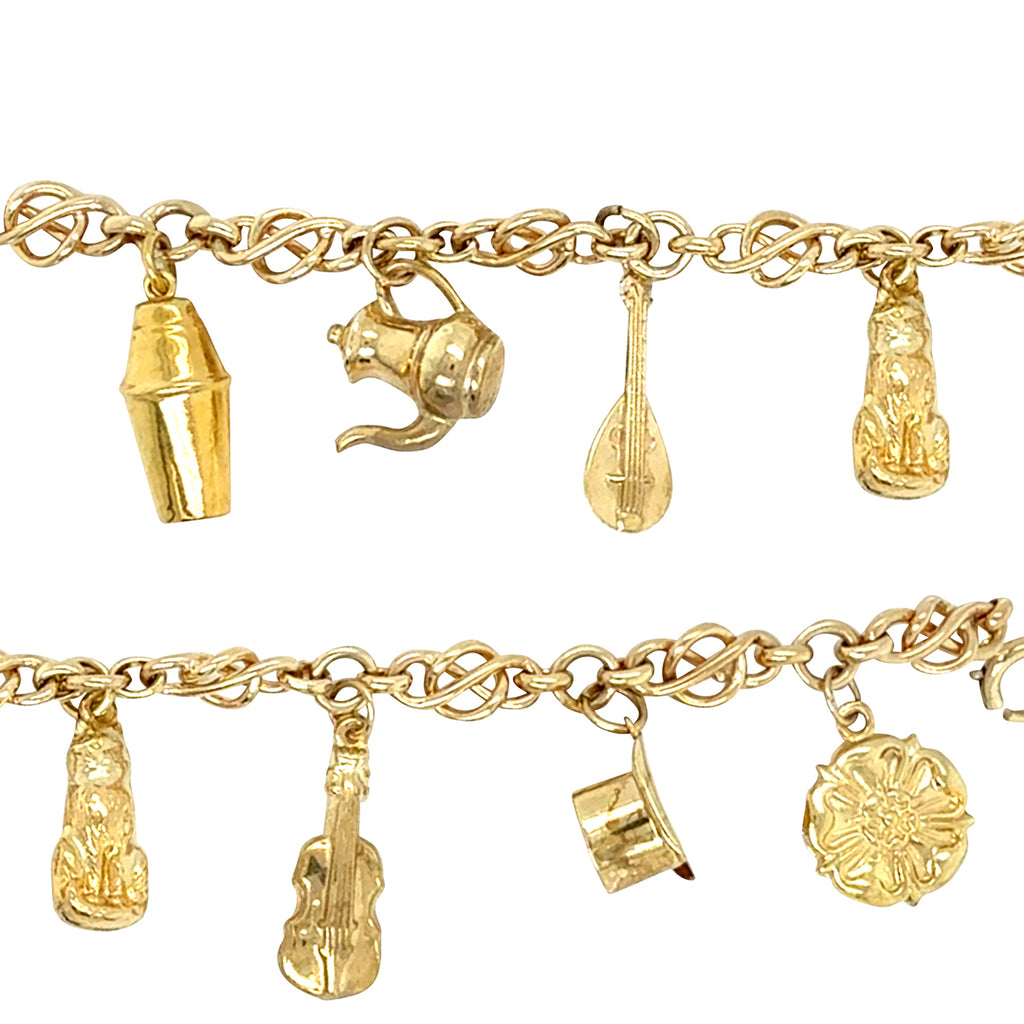 9ct Yellow gold fancy link bracelet with 8 charms attached. Bracelet Hallmarked and dated Birmingham UK 1963.