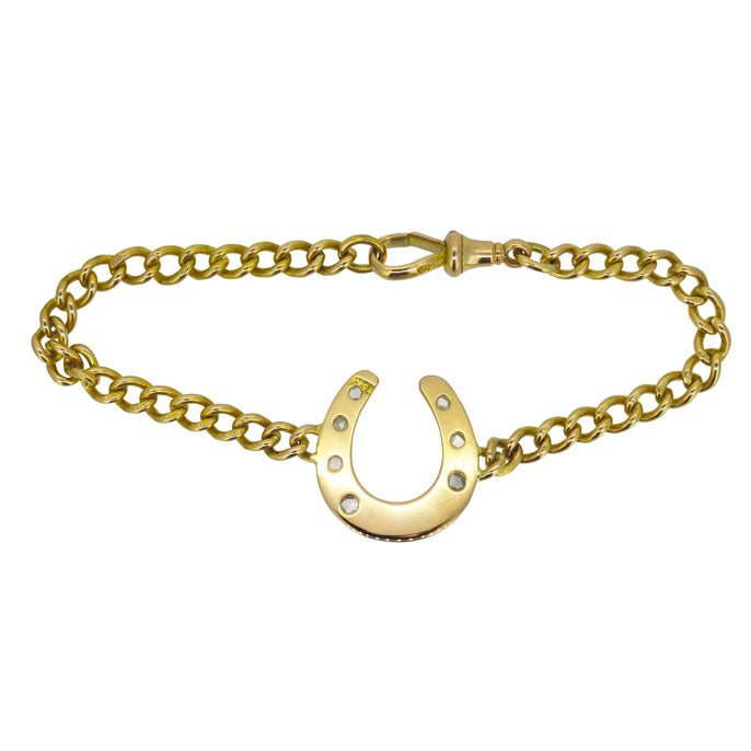 15ct Gold horse shoe set with seven rose cut diamonds, on a curb link chain. Circa 1900.
