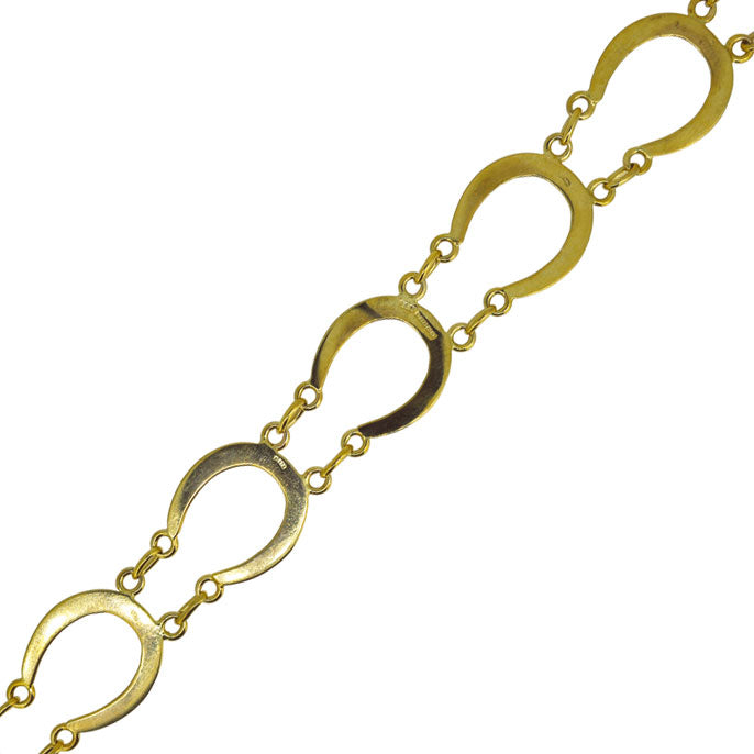 9ct Yellow gold horse shoe link bracelet, with unique horse shoe fastening. Hallmarked Birmingham 1986.