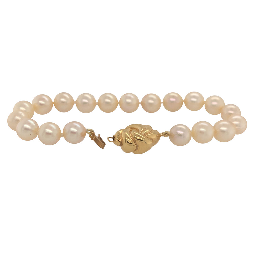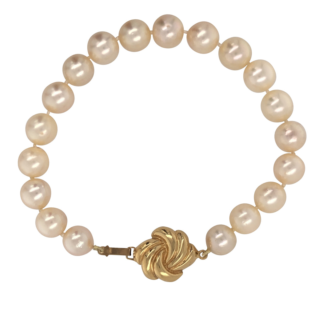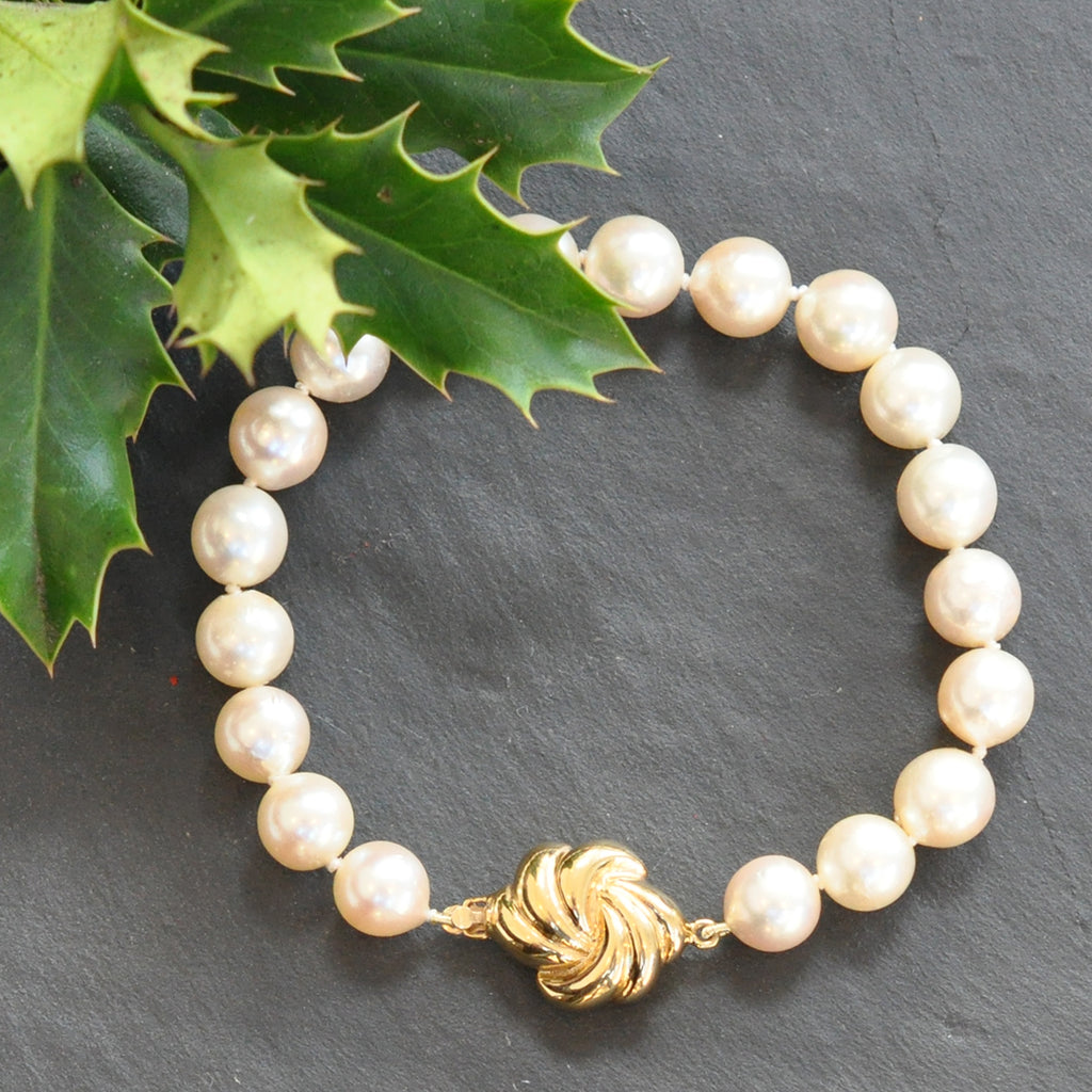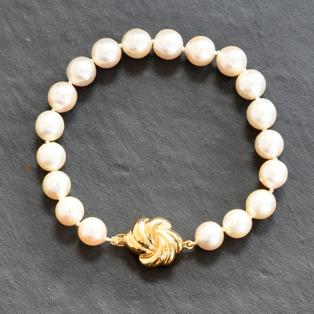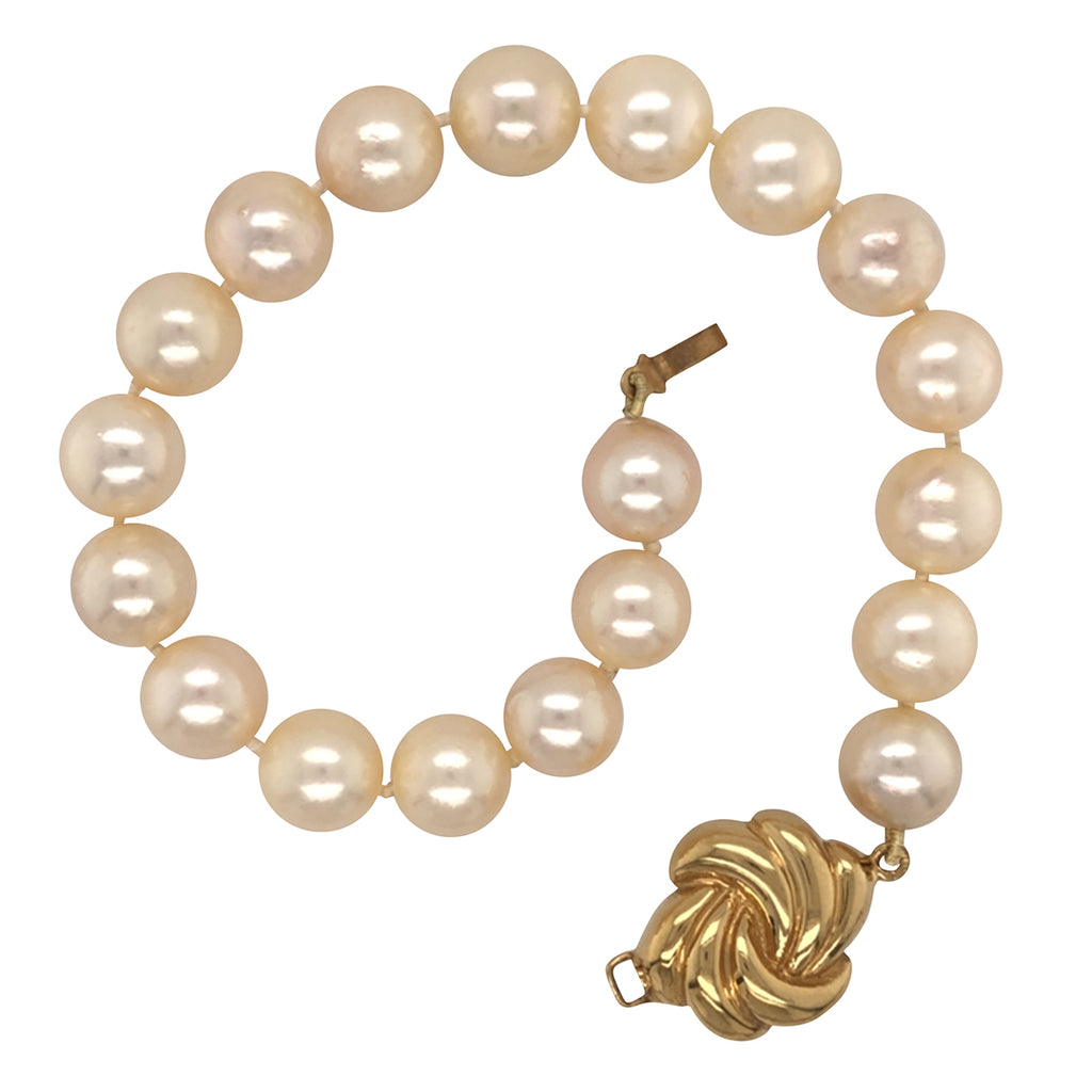 A single row of uniform cultured pearls with a 18ct Yellow gold 'knot' clasp. Clasp Hallmarked and dated London 1992.