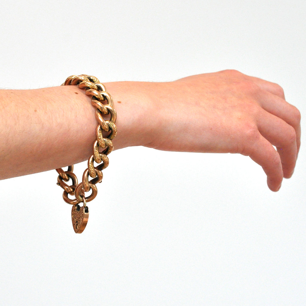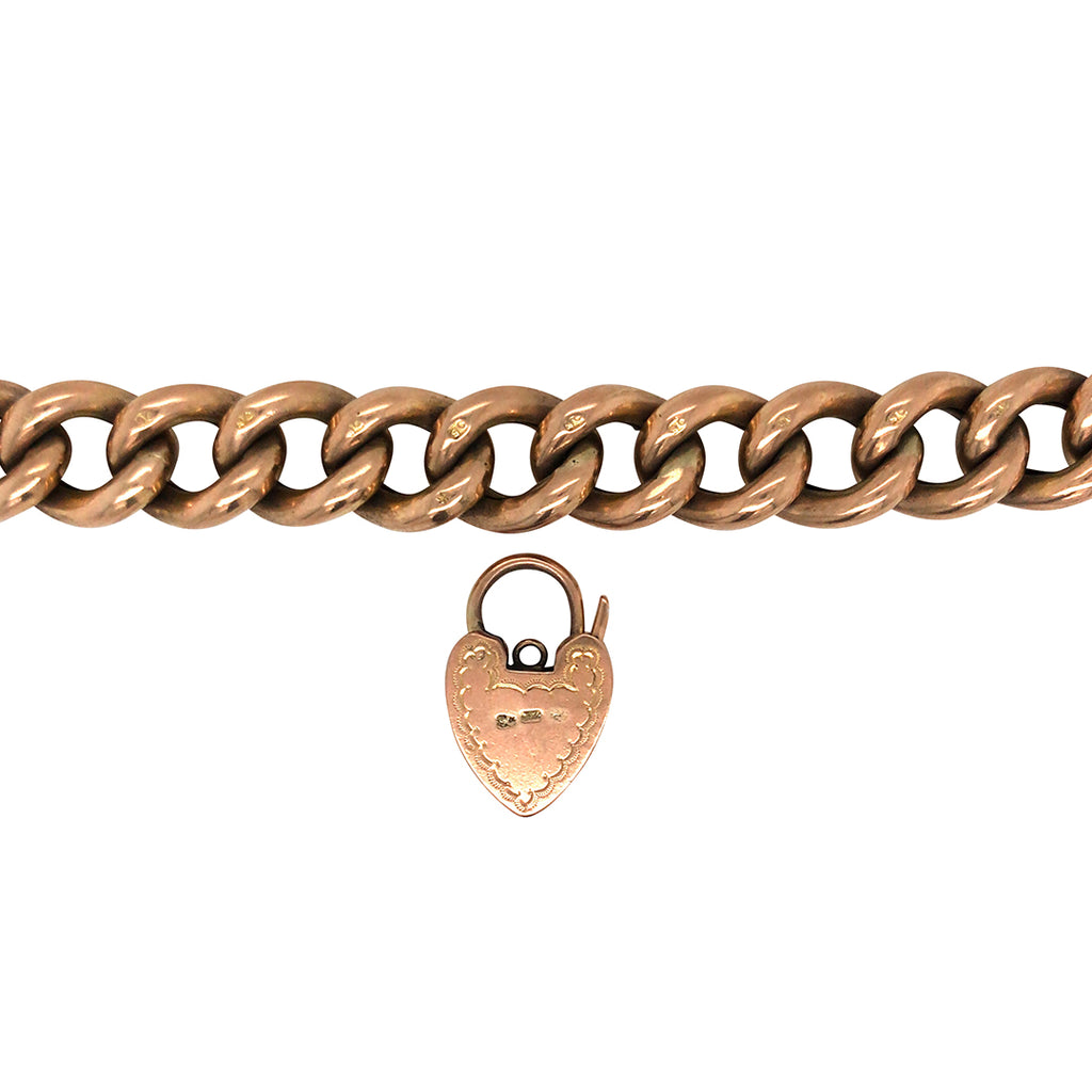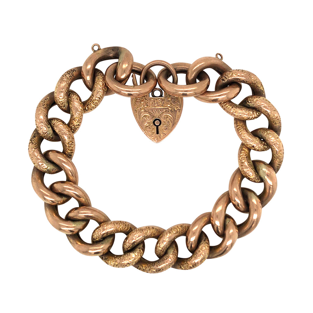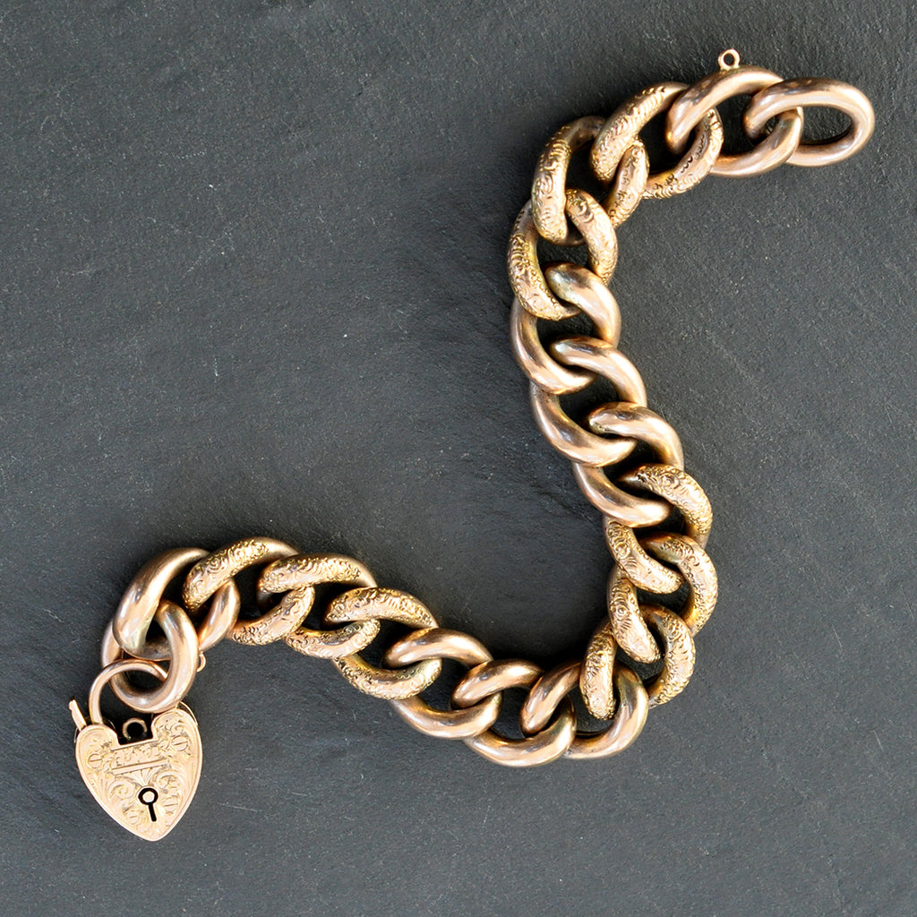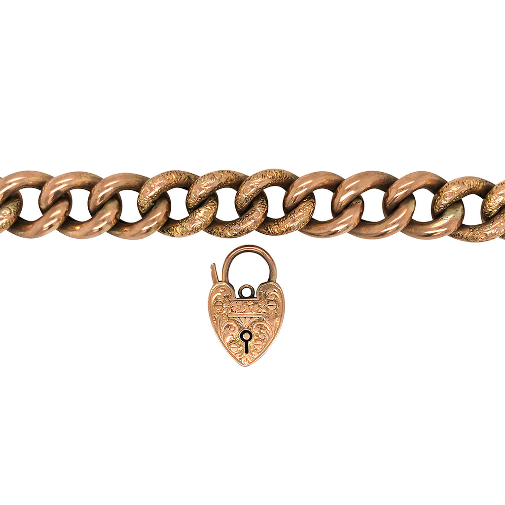 9ct Rose gold fancy curb link bracelet with heart shaped padlock clasp. A beautiful textured finish to one side of alternate links. Circa 1900.