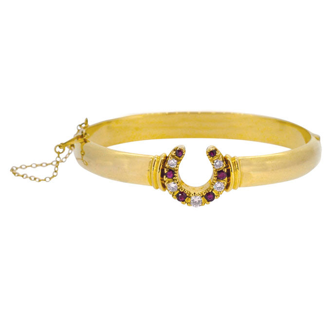 18ct Yellow gold bangle with a horse shoe set with six rubies and five diamond, alternatively. Diamond weight apron 0.35 cts. With safety chain.