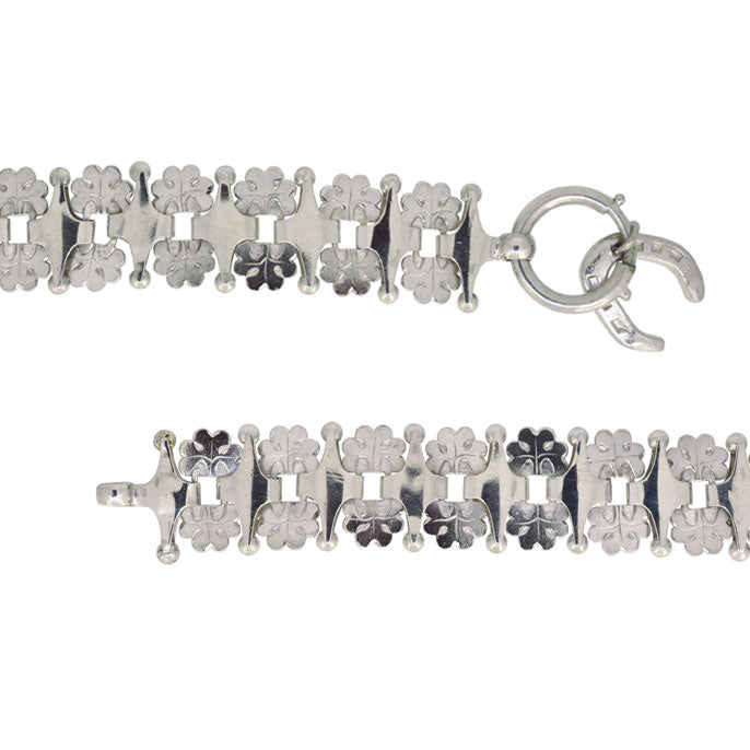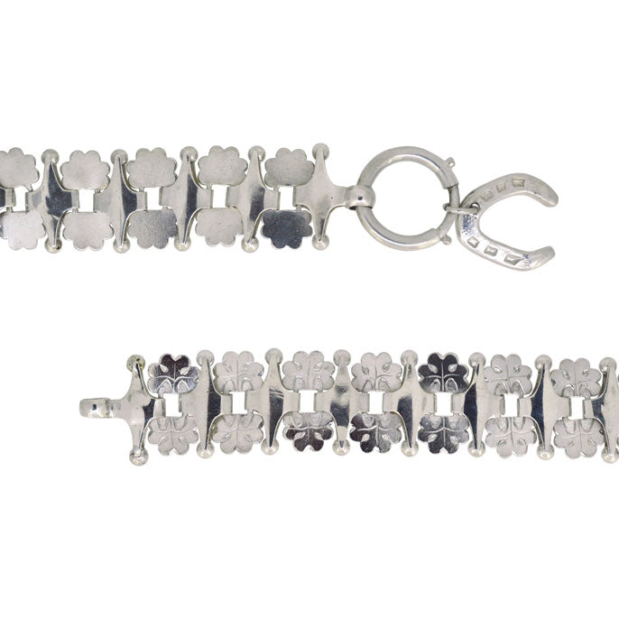 Victorian silver fancy link bracelet with a horse shoe charm attached to the fastening. Circa 1880.