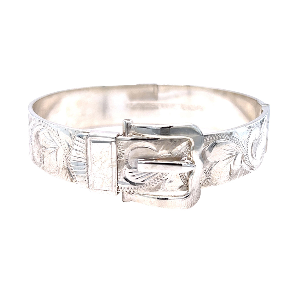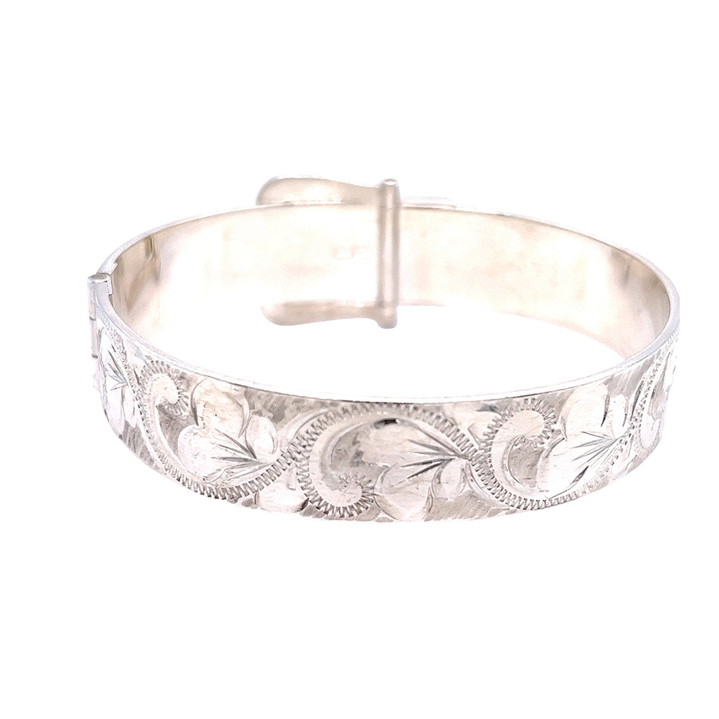 Silver engraved bangle with a 'buckle' closure. Hallmarked and dated Birmingham UK 1978.