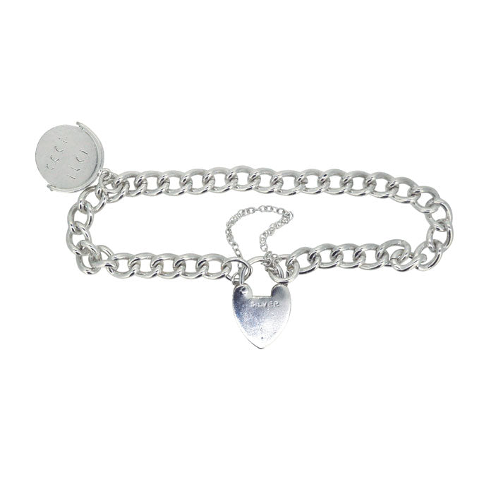 Silver curb link bracelet with heart shaped padlock clasp and a 'GOOD LUCK' spinning charm. Circa 1960.