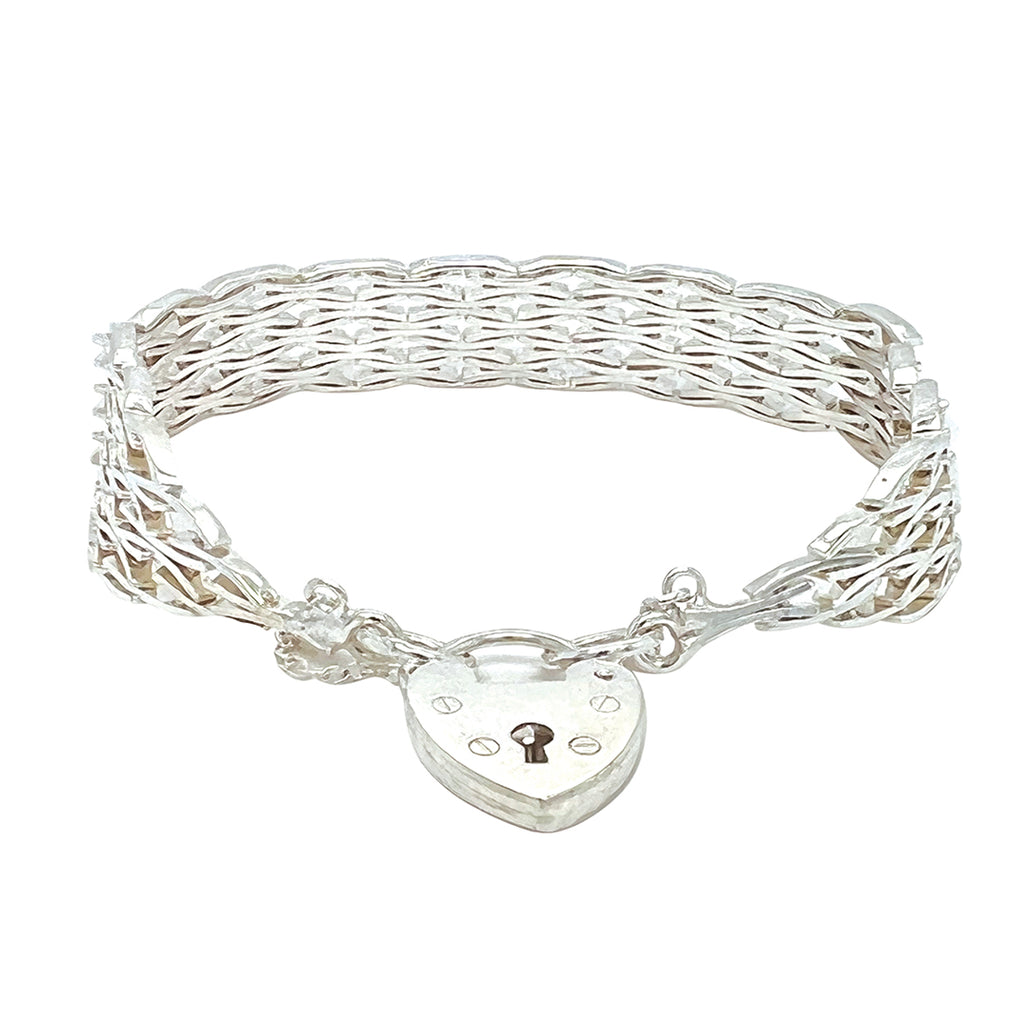 Silver gate link bracelet with a padlock clasp and safety chain. Hallmarked and dated London 1979.