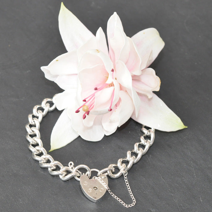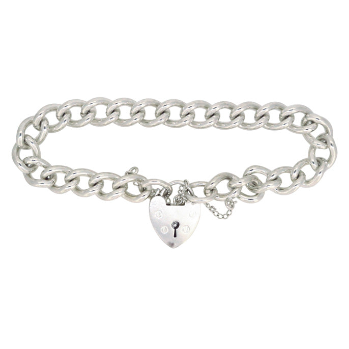 Silver curb link bracelet with heart shaped padlock attached. Hallmarked and dated London 1976.