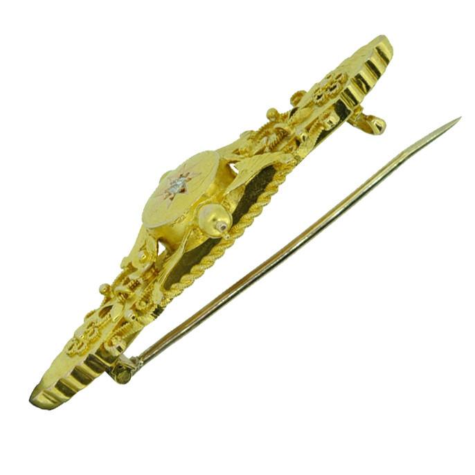 15ct Yellow gold fancy bar brooch with a single diamond set to the centre. Hallmarked and dated Chester 1906.