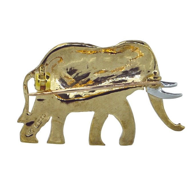 9ct Yellow and white gold elephant brooch with textured finish to the body. Hallmarked London 2001, with safety catch
