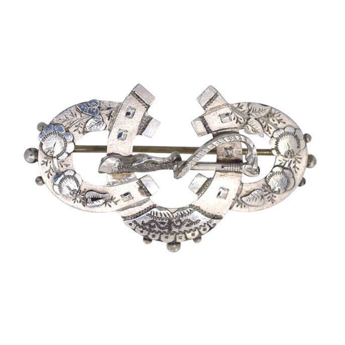 Silver fancy engraved three horse shoe brooch with whip to the centre, hallmarked silver and dated Birmingham 1889