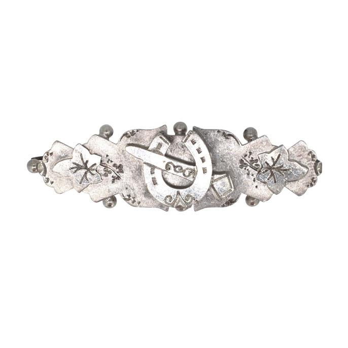 Silver horse shoe with shoe nail brooch with ivy leaves to each end, hallmarked and dated Birmingham 1902