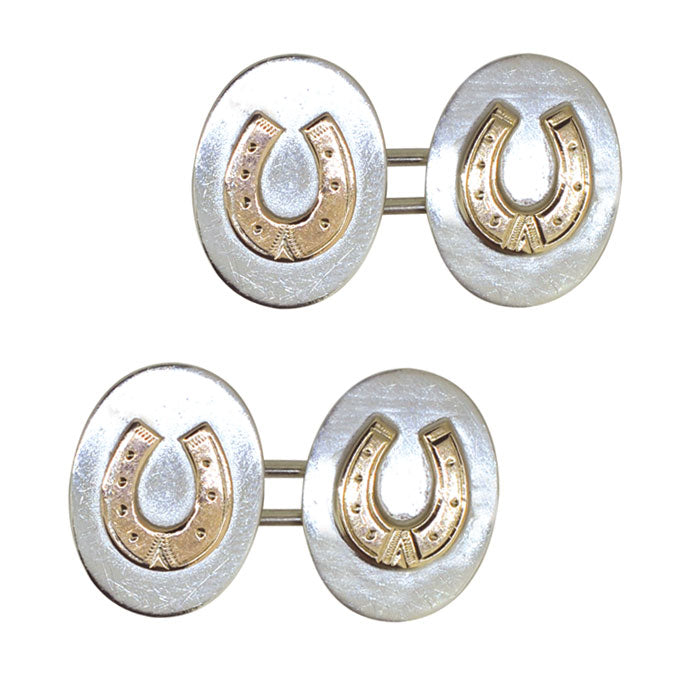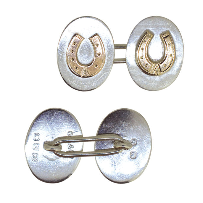 Antique silver oval cufflinks with a raised horse shoe with rose gold onlay. Chain links, Hallmarked Birmingham 1896