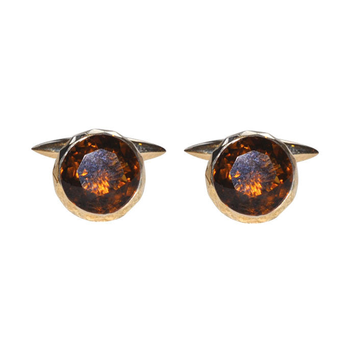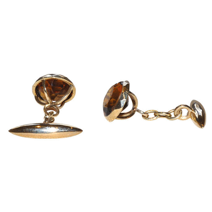 Cuff-links set with facetted citrines, in a rub-over setting that is facetted around the edge to match the cut of the stone, tested as 9ct rose gold, with torpedo backs and chain connections, circa 1910