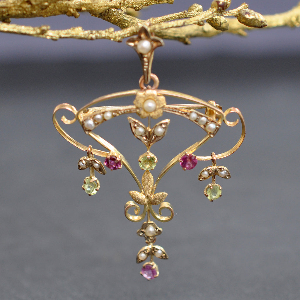Edwardian 9ct yellow gold pendant/brooch set with pink tourmaline, peridot and pear. The gemstone colours in this piece are classic of the suffragette movement.
