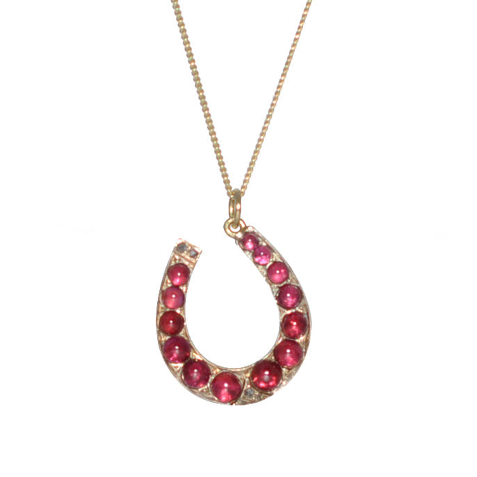 Victorian 9ct gold horse shoe set with 13 cabochon cut garnets and 3 rose cut diamonds. Circa 1890.
