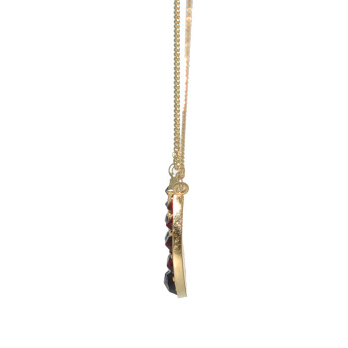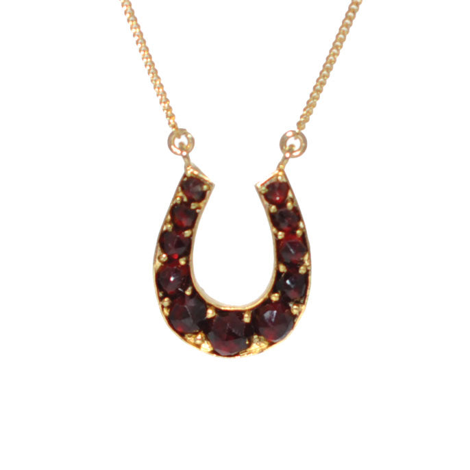 Victorian 18ct yellow gold, 11 stone garnet horse shoe pendant necklace.