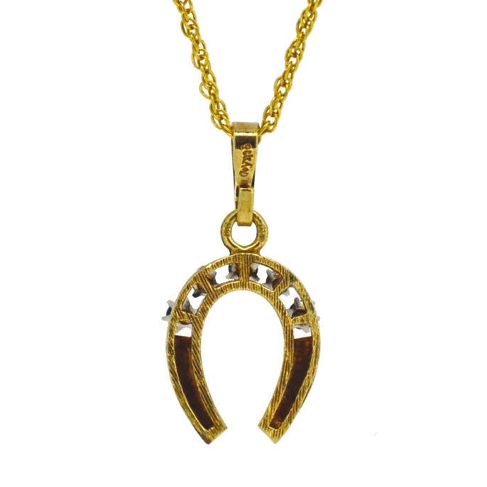 9ct Yellow gold horse shoe set with three sapphires and two diamonds.