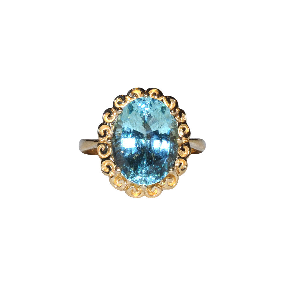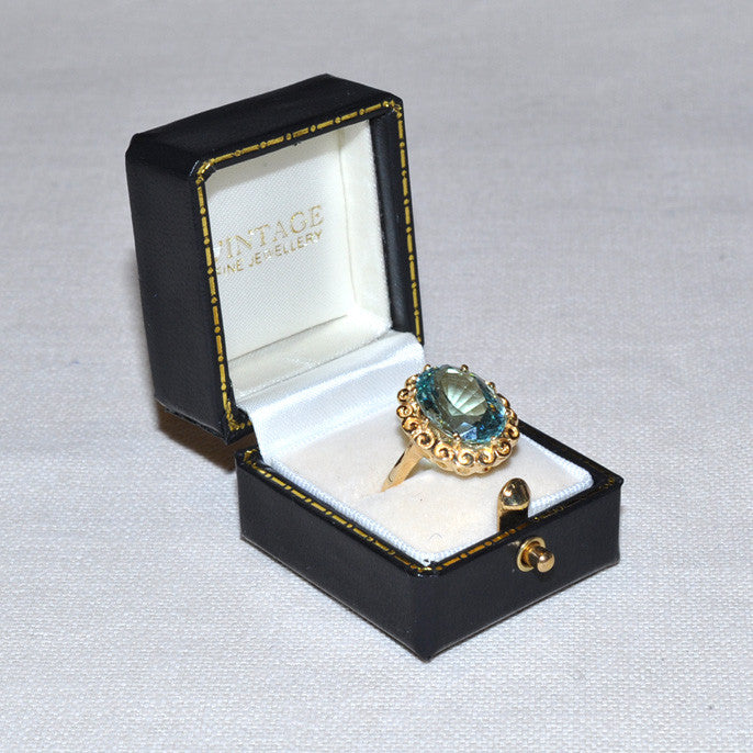Beautiful aquamarine cocktail ring. Oval aquamarine in a fancy 9 carat yellow gold setting. Hallmarked and dated London 1970. Vintage cocktail ring in excellent condition.