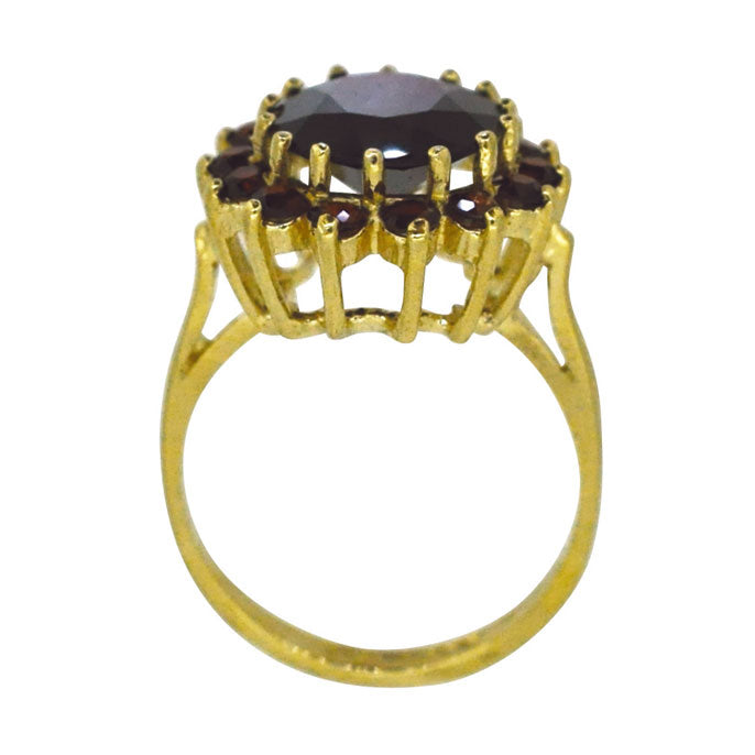 9ct Yellow gold ring with an oval garnet set to the centre with 14 smaller garments to the edge. A beautiful dress. Hallmarked and dated Birmingham UK 1975.