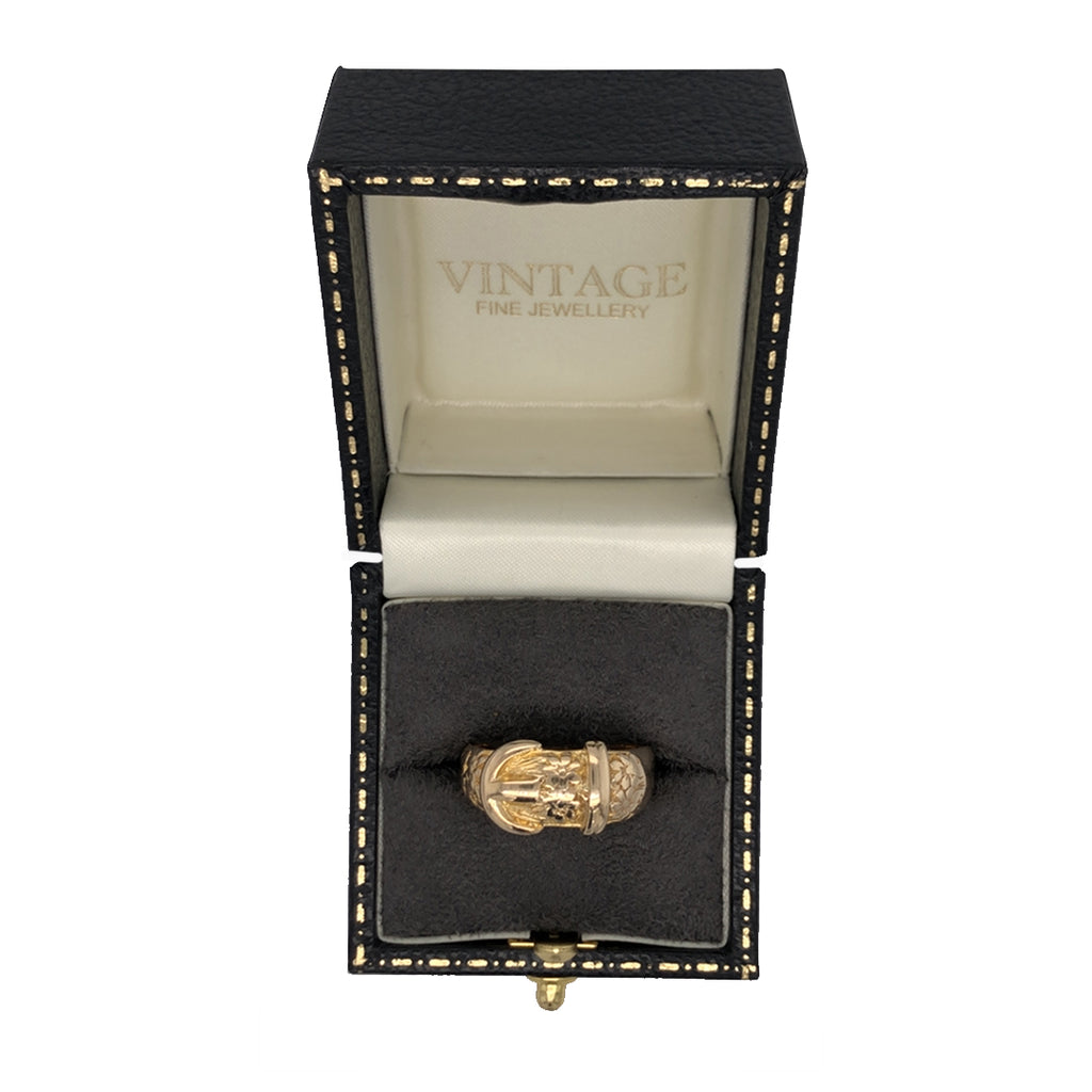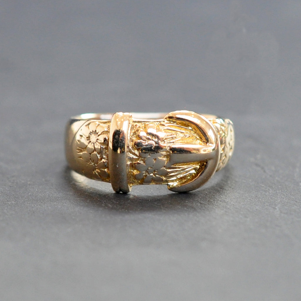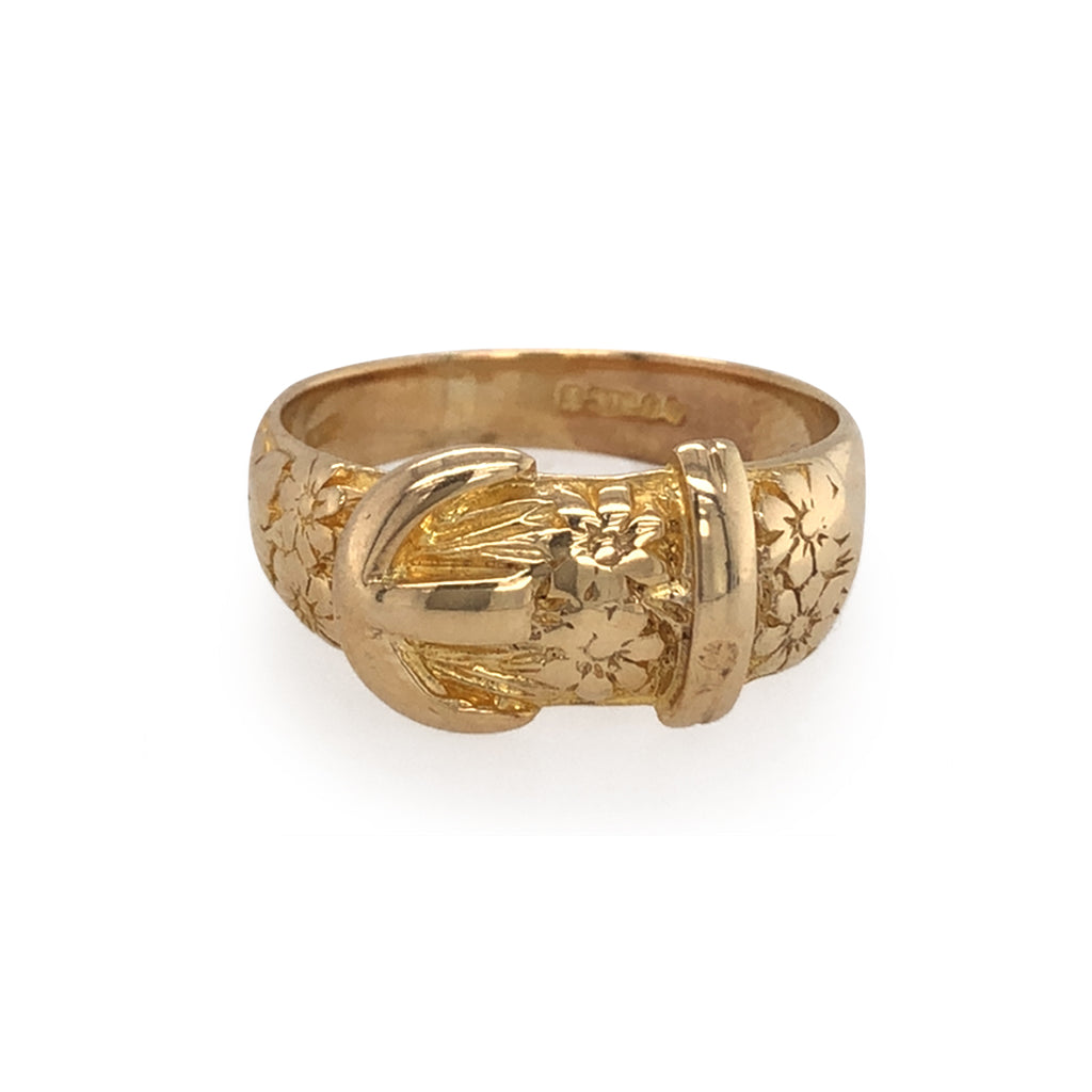 9ct yellow gold buckle ring with flowers engraved to the front. Hallmarked and dated London 1964.