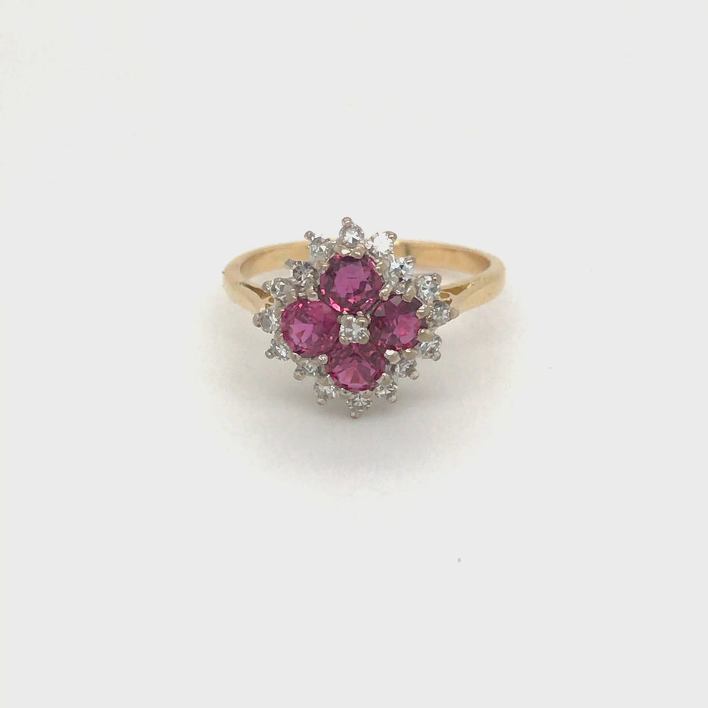 18ct Yellow and white gold ring with a cluster of 4 rubies and 17 diamonds (total weight approx 0.36 cts, colour G, clarity SI1). Circa 1960.