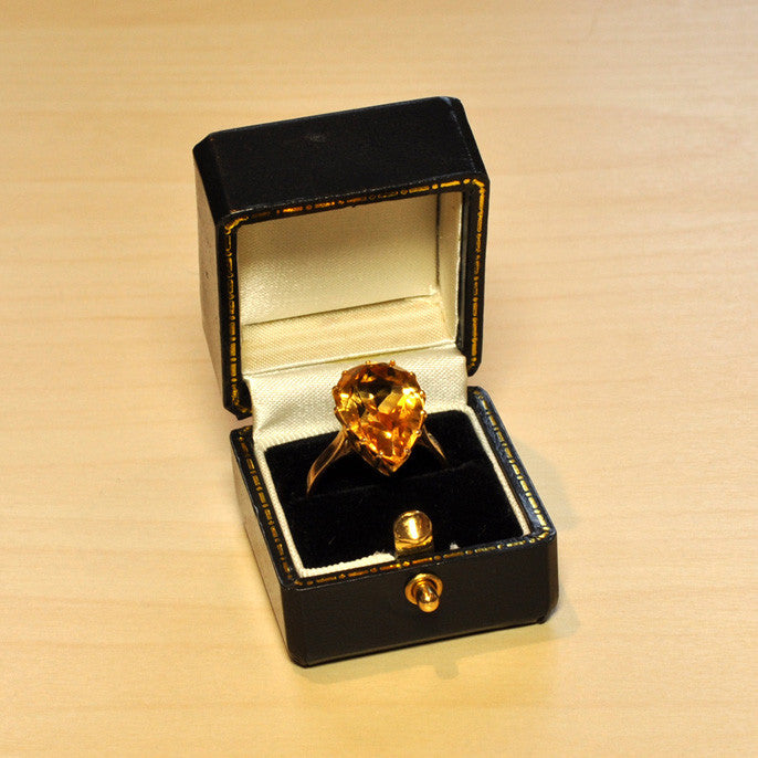 Dress ring claw set with large 'pear' shaped citrine (appx. 17.65 mm x 11.40 mm), tested as 18ct yellow gold, circa 1960's, size O