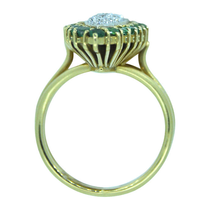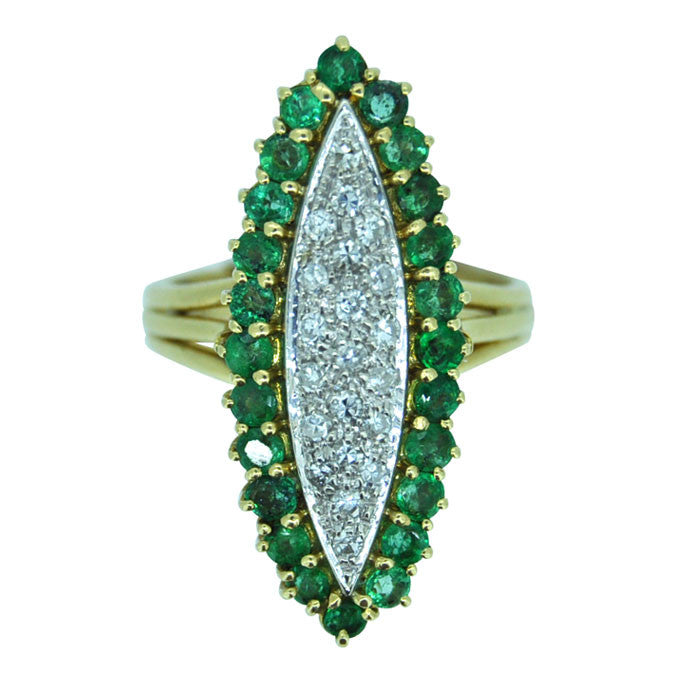 Diamond and emerald marquise shaped cluster ring, pave set to the centre with twenty-one diamonds, surrounded by twenty-four claw set emeralds, tested with acid and 18ct yellow gold, circa 1960's, size J1/2