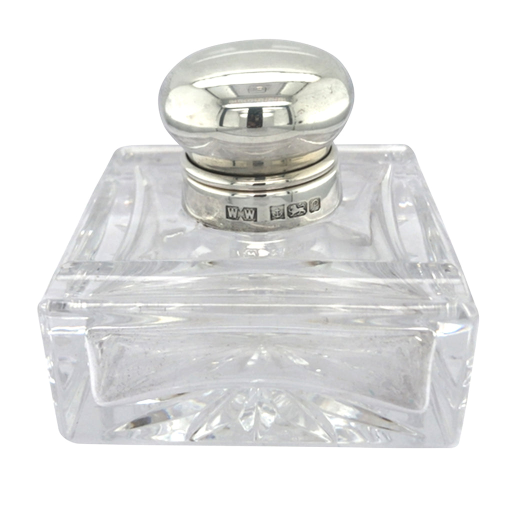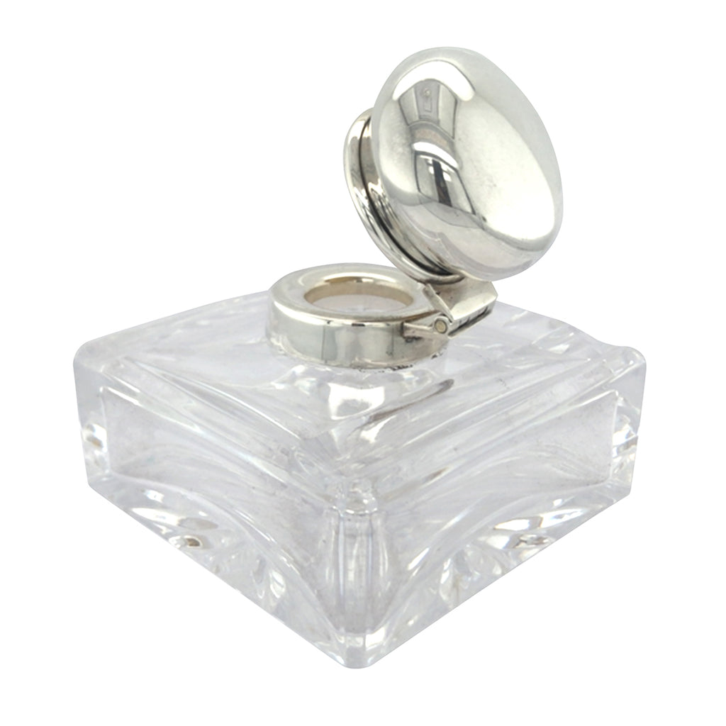 Plain square glass inkwell with a groove to each side to lay a pen with a plain round hinged lid. Hallmarked and dated Birmingham UK 1989.