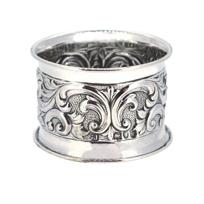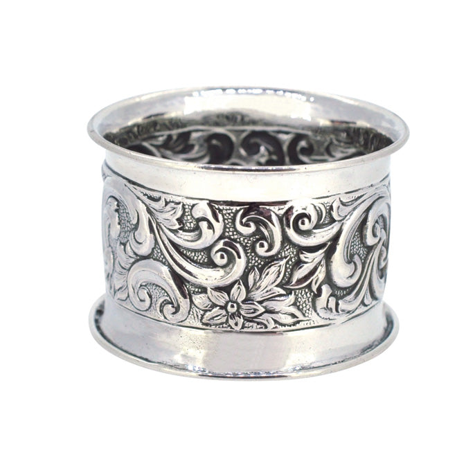 Antique silver embossed napkin ring. Hallmarked and dated Chester UK 1900,