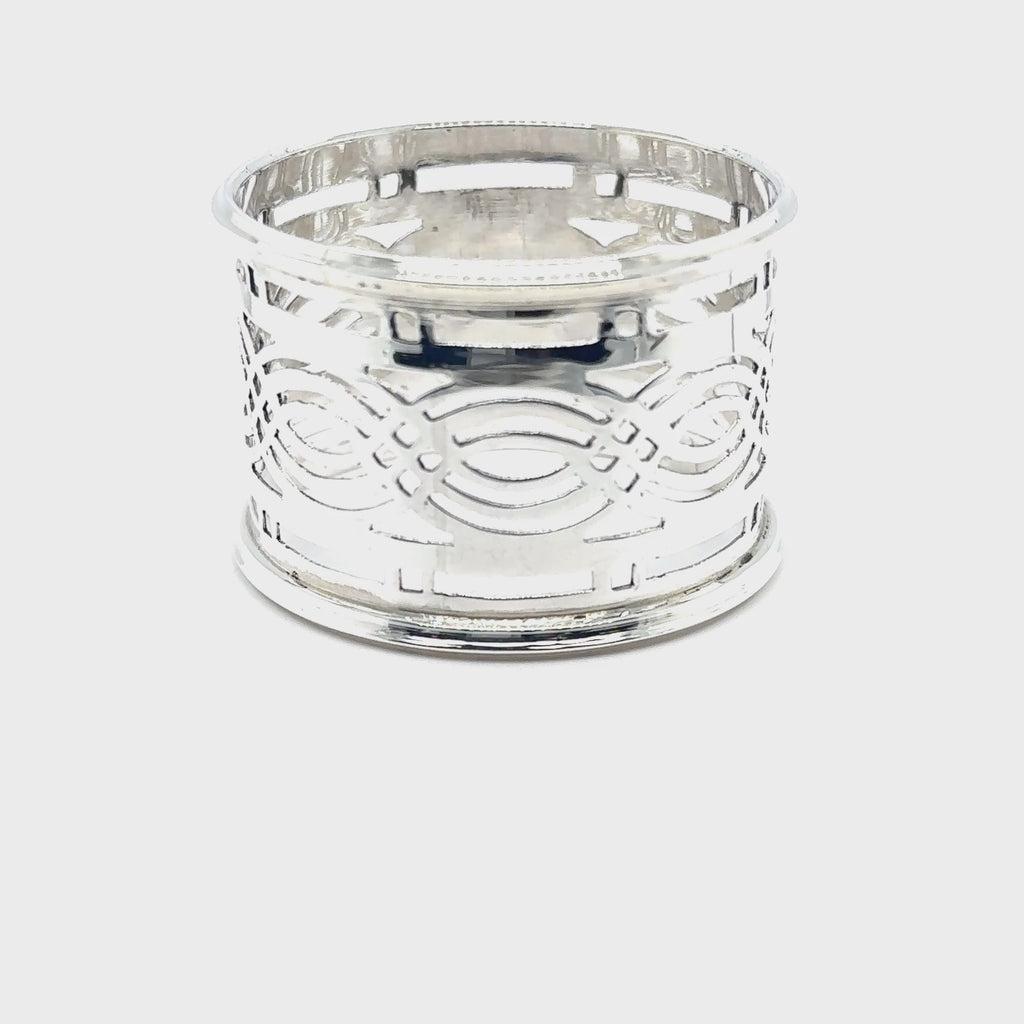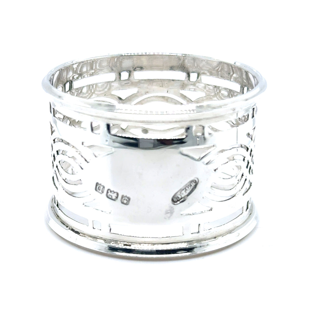 Silver napkin ring with fancy pierced surface. Hallmarked and dated Birmingham UK 1928.