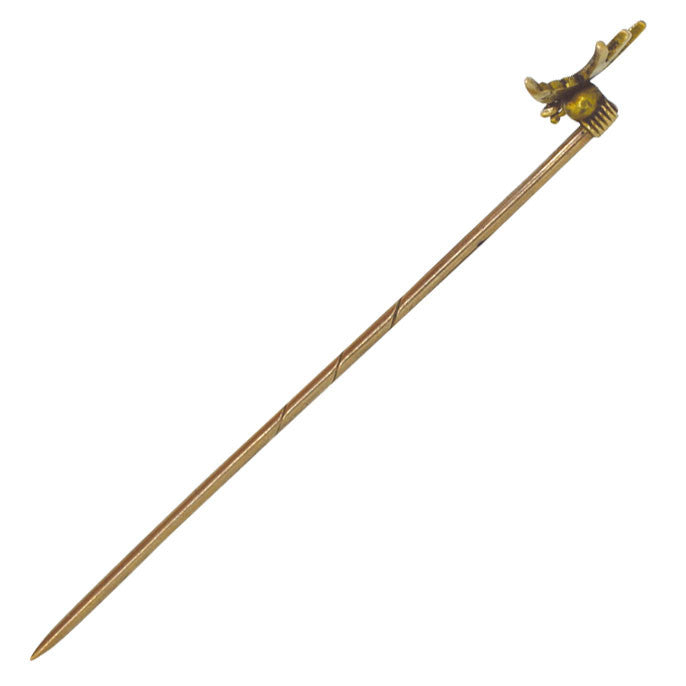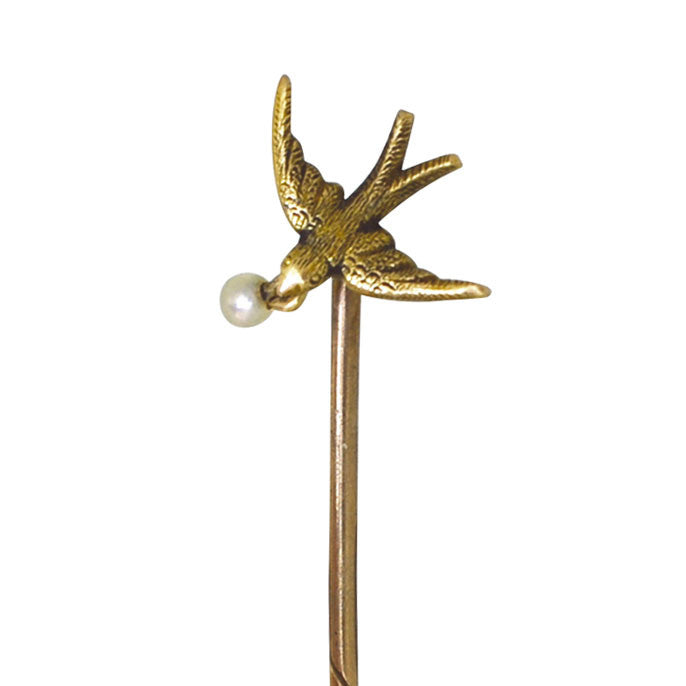 Victorian 15 ct gold bird tie pin with single pearl. Circa 1890. Marked 15ct, tested as 15ct.