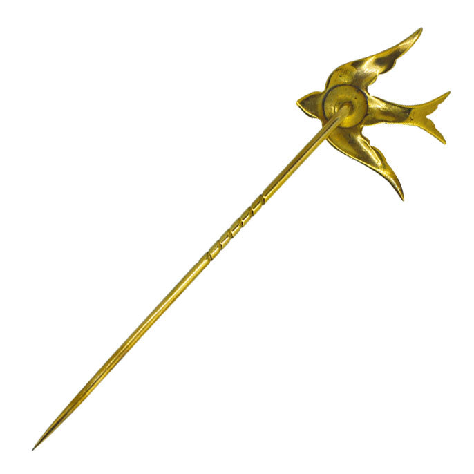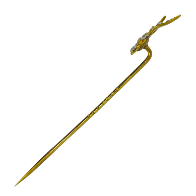 15ct Yellow gold bird tie pin, set with 16 seed pearls. Circa 1880.