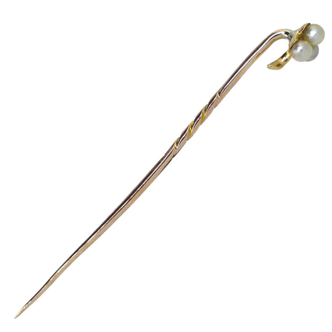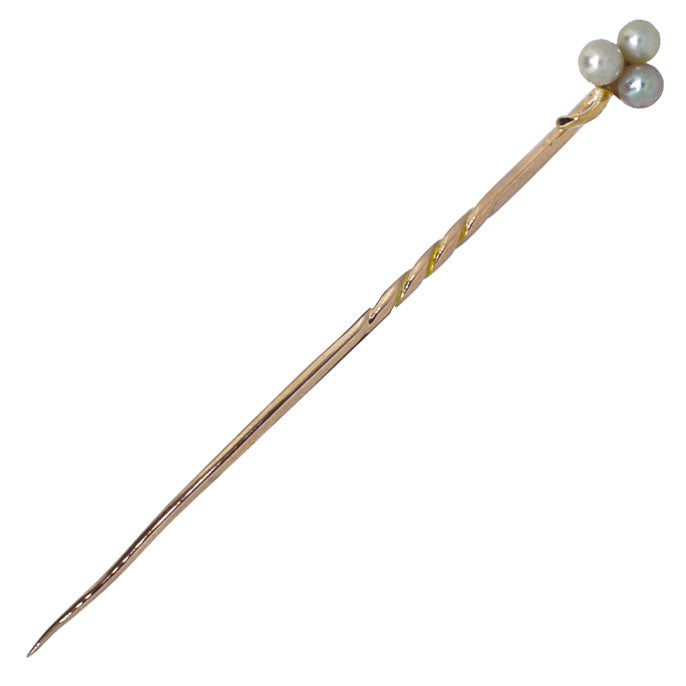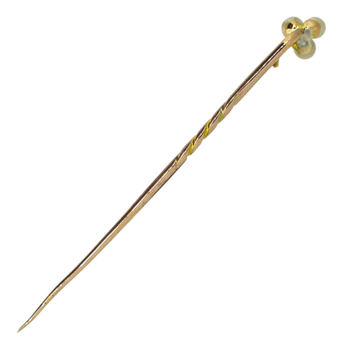 Victorian 9ct gold stick pin with a pearl clover set to the top. Circa 1890.