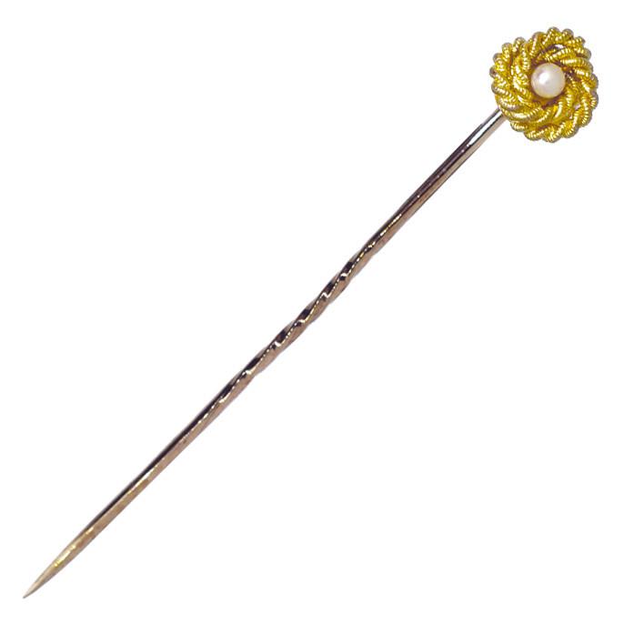 Victorian Stick Pin, a rope knot set to the centre with a single pearl, marked '15ct' tested with acid as 15ct yellow gold, circa 1890