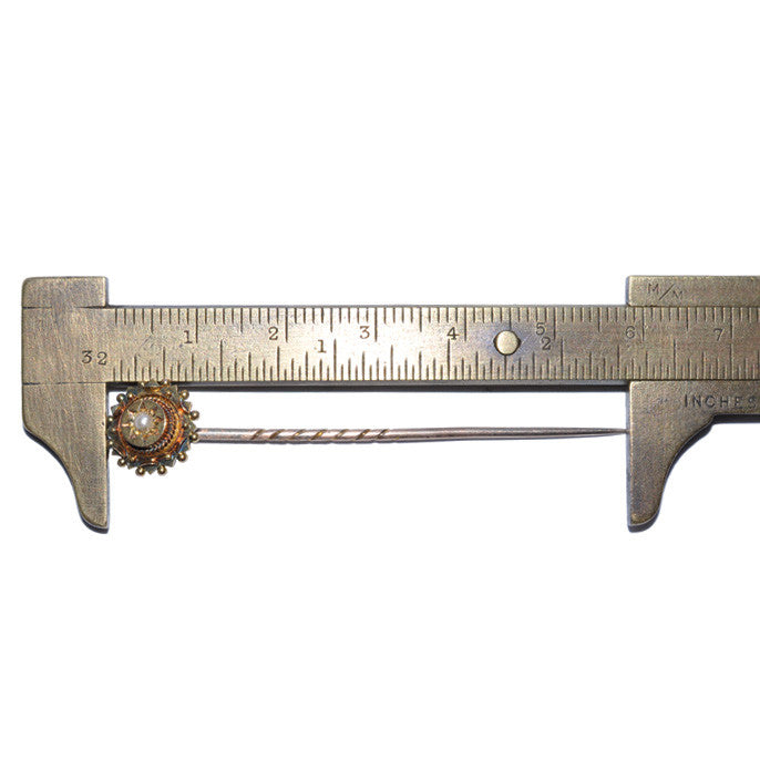 Victorian stick pin, fancy circular set to the centre with a single pearl, circa 1890, tested with acid as 15ct yellow gold and marked '15ct'