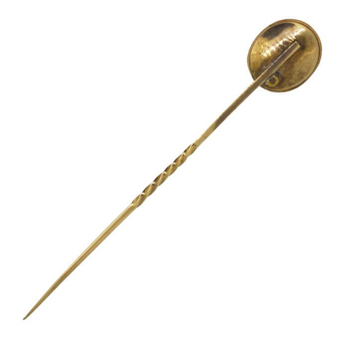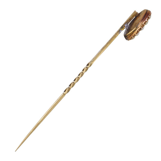 Oval turquoise surrounded by seed pearls. In 9ct yellow gold setting on a 9ct gold pin. Tested as 9ct gold. Circa 1890.