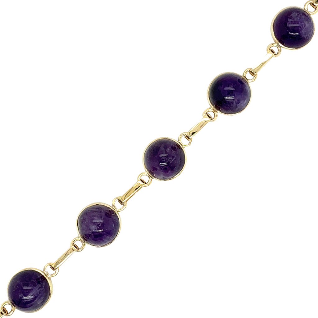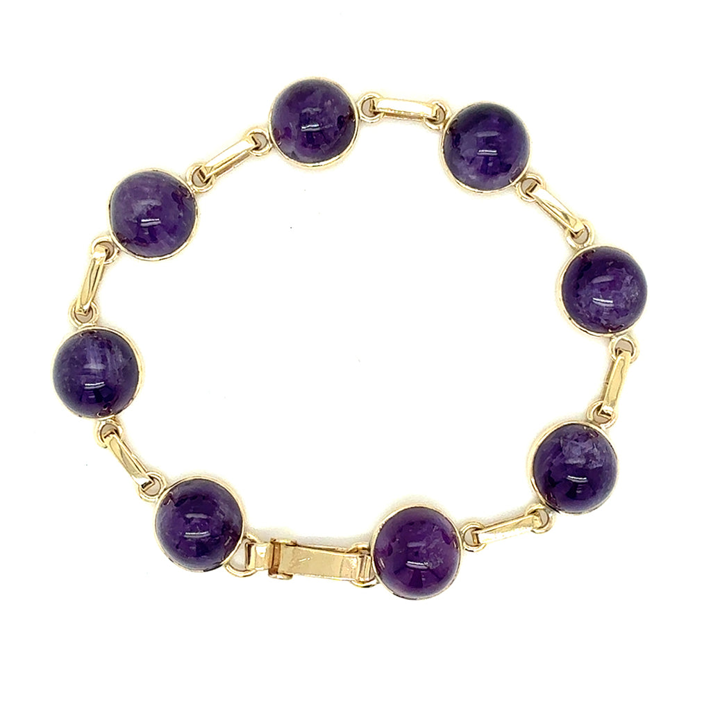 9ct Yellow gold amethyst bracelet. 8 Cabochon cut round amethyst joined by gold links. Circa 1950.