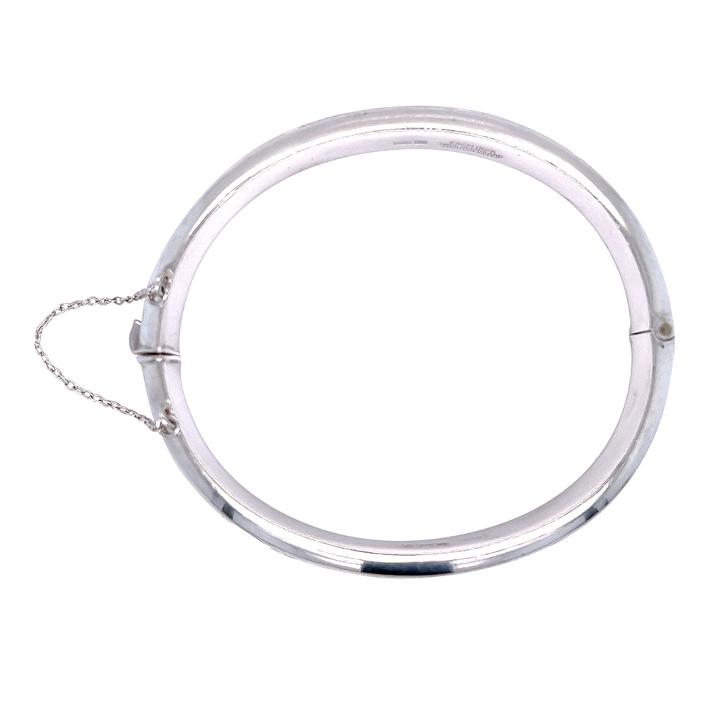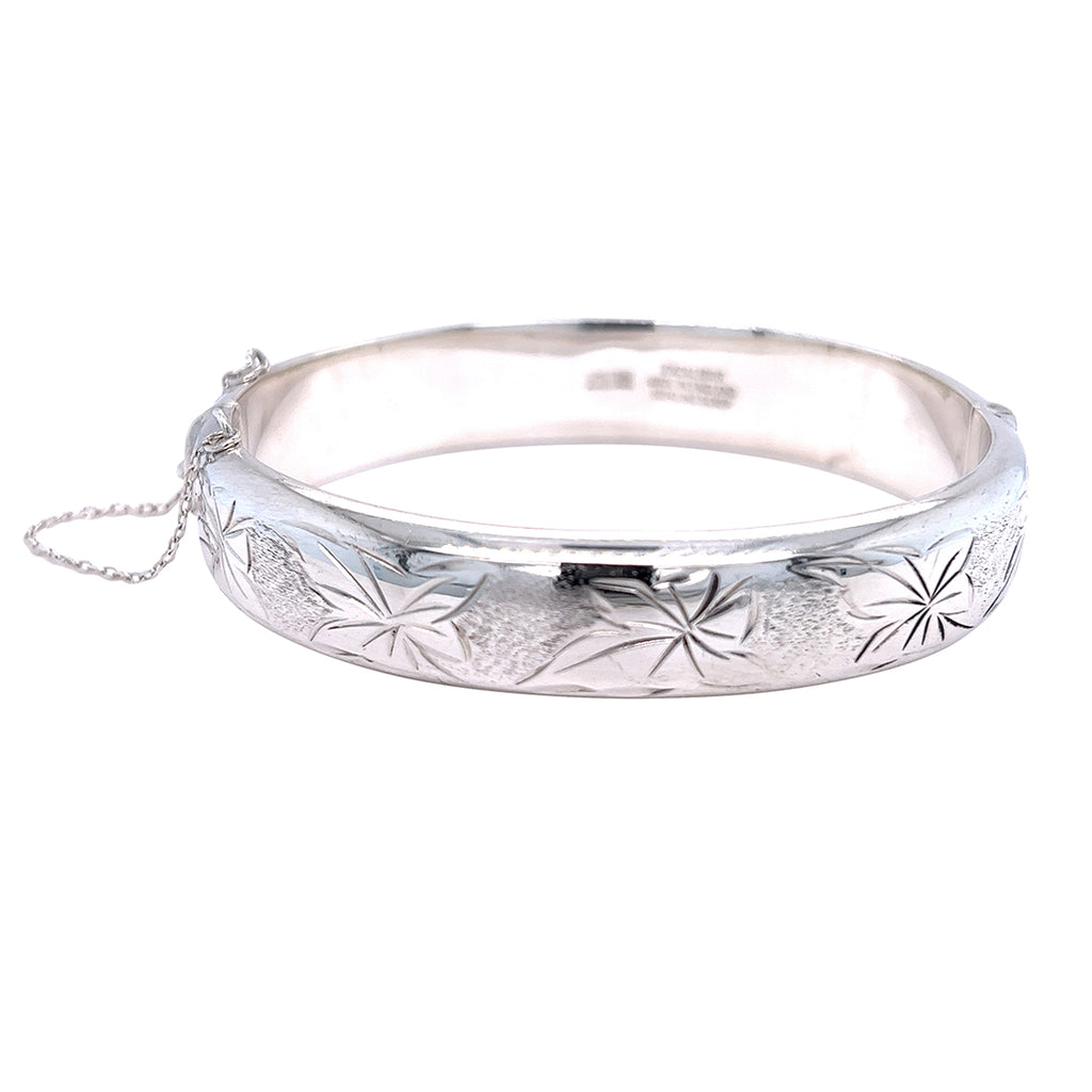 Silver bangle with a leaf pattern to the outer surface. With safety chain. Hallmarked and dated Birmingham 1971.