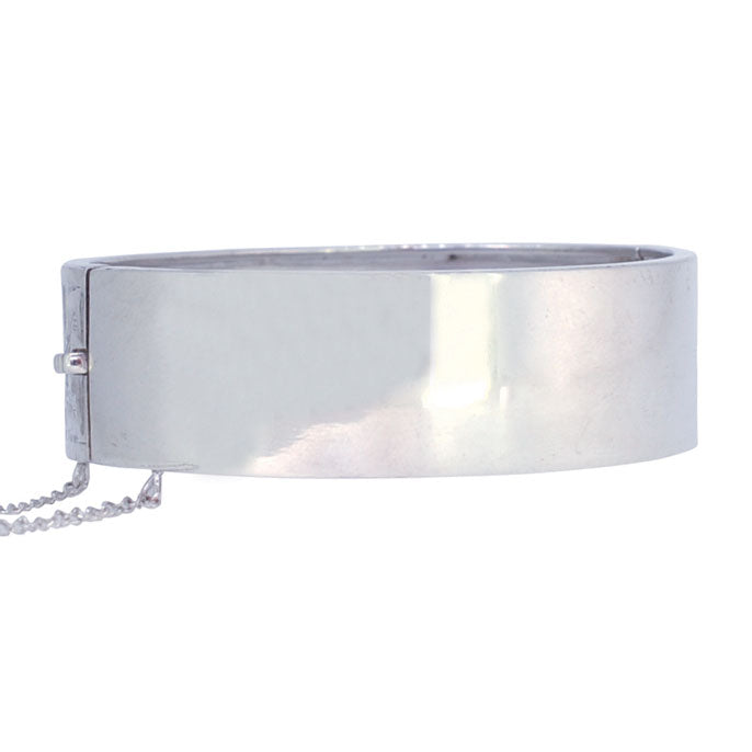 Vintage silver bangle with fancy leaf pattern engraved to one half, other half plain. Hallmarked Birmingham 1939. With safety chain. Excellent condition.