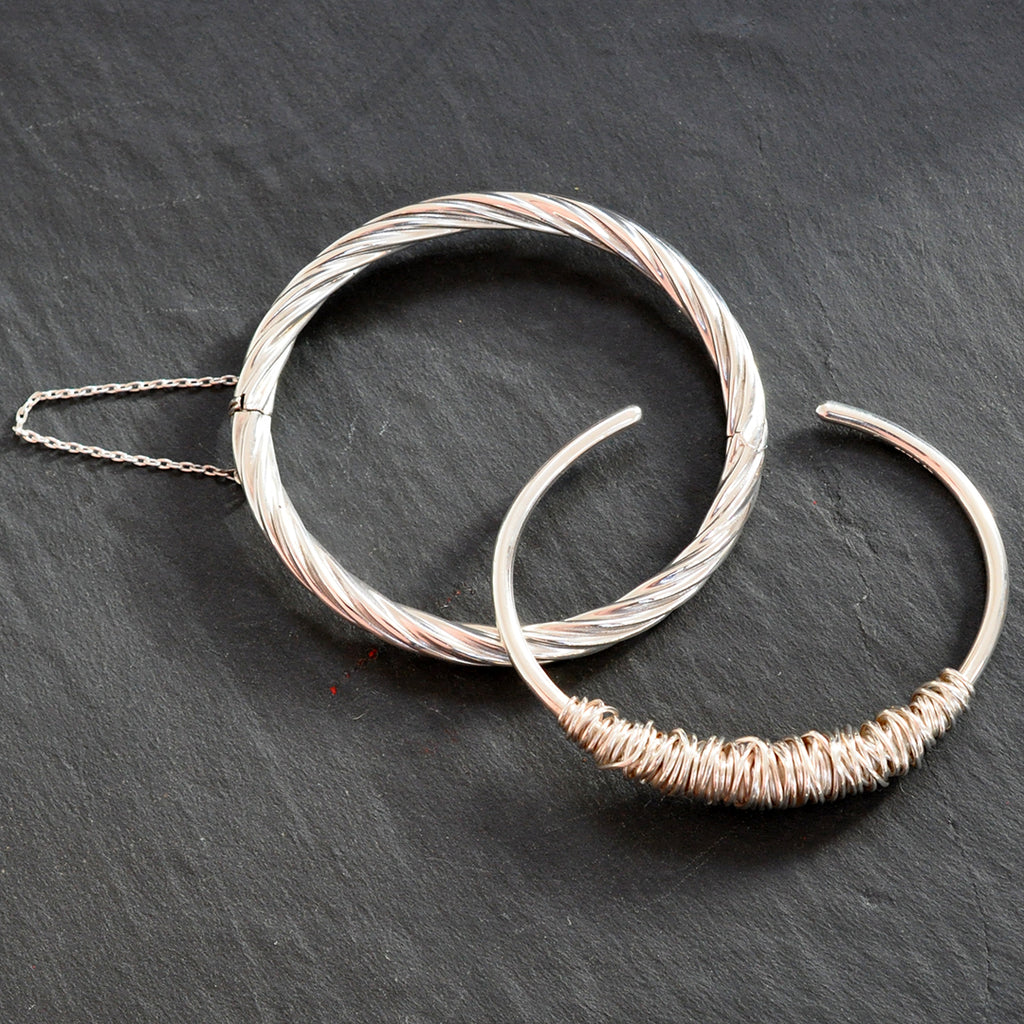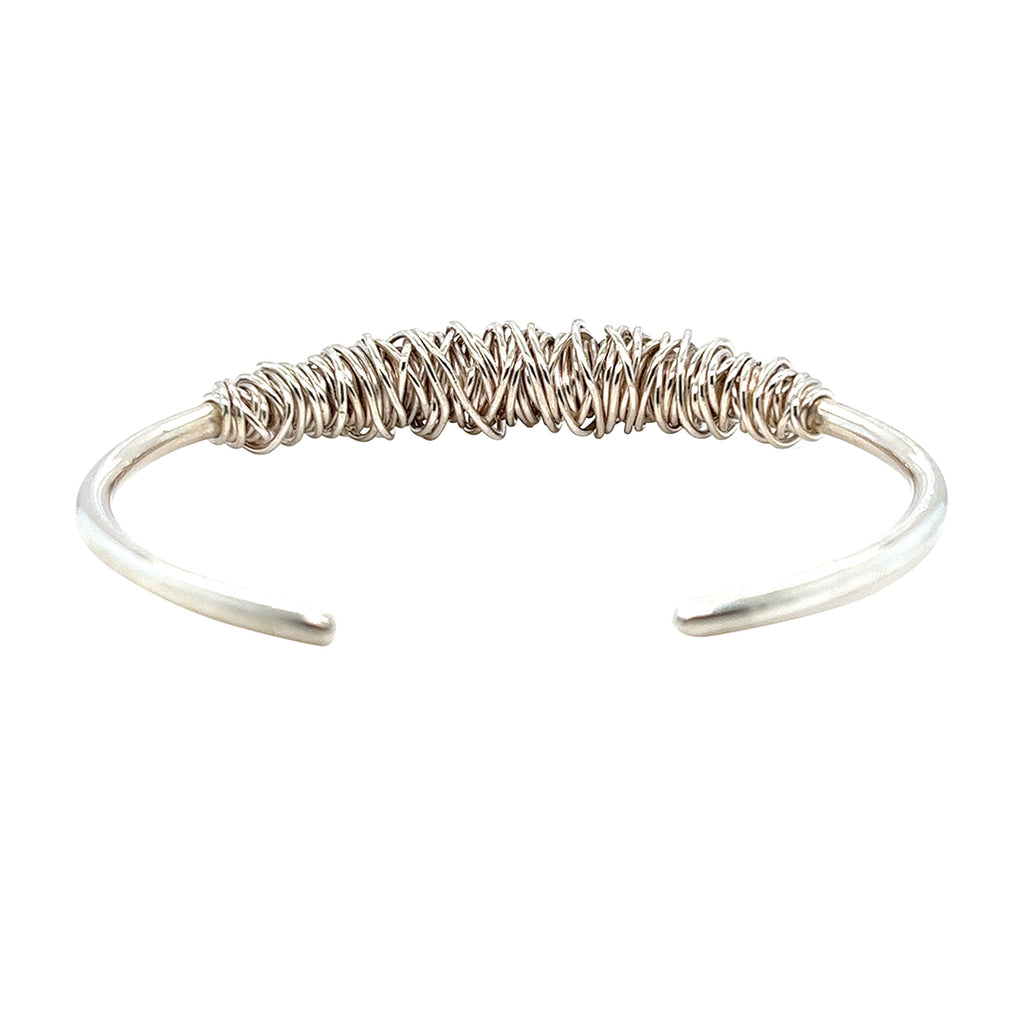 Silver open back bangle with wire wrapped around the front. Hallmarked and dated London 2011.