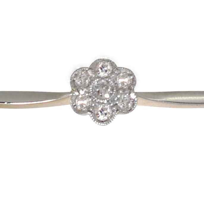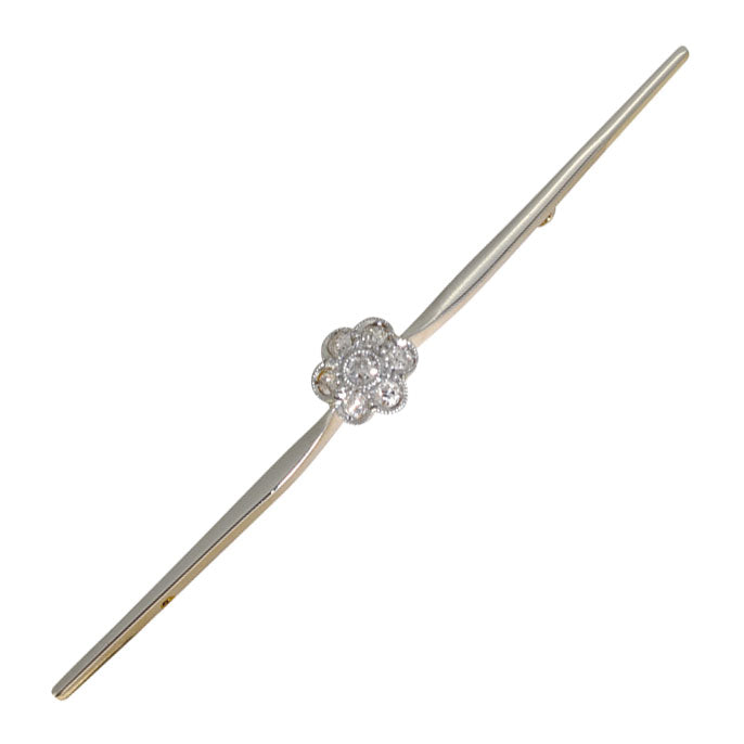 Diamond bar brooch, a plain bar with a cluster of seven diamonds to the centre arranged in a daisy shape. Tested as 18ct yellow and white gold, with a safety catch. Circa 1920s.